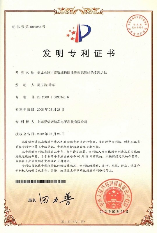 2012年7月25日,上海愛信諾榮獲集成電路中素數(shù)域橢圓曲線密碼算法的實現(xiàn)方法的發(fā)明專利證書,專利號為:ZL 2008 1 0035343.6,證書編號為:1010288。