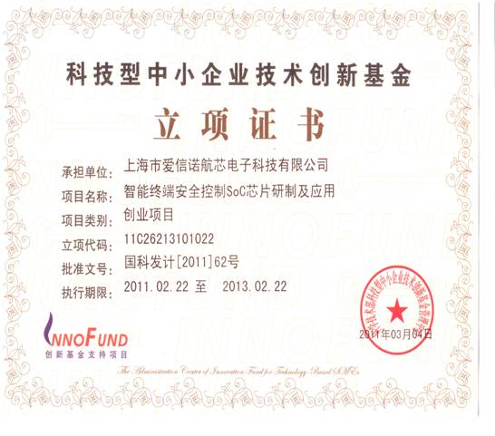 我公司"智能終端安全控制SOC芯片研制及應用" 獲2010年 科技中小型企業創新基金支持。
