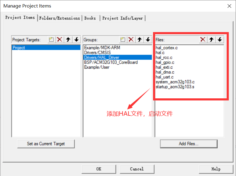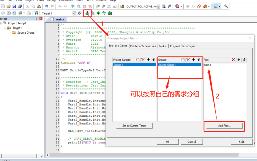 通過Add Files可以添加自己編寫好的源文件(.C)或者別的demo文件中的源文件,通過Add Group可以添加文件組,來給每個文件分組。