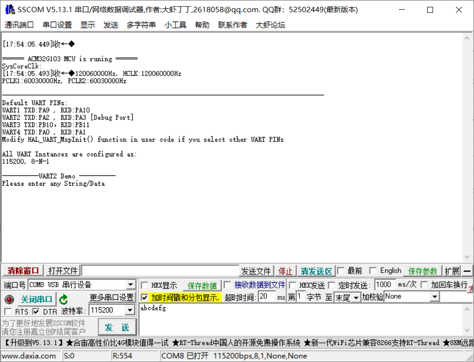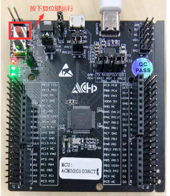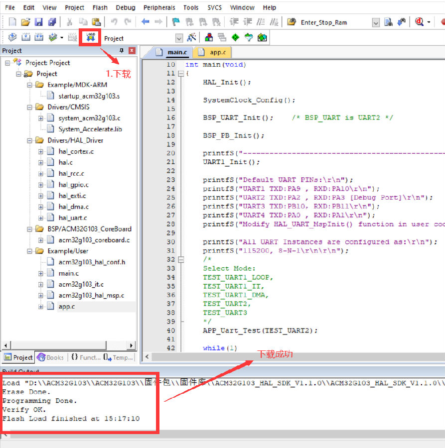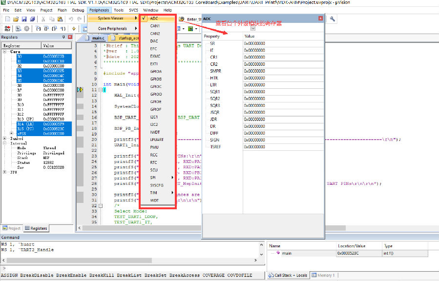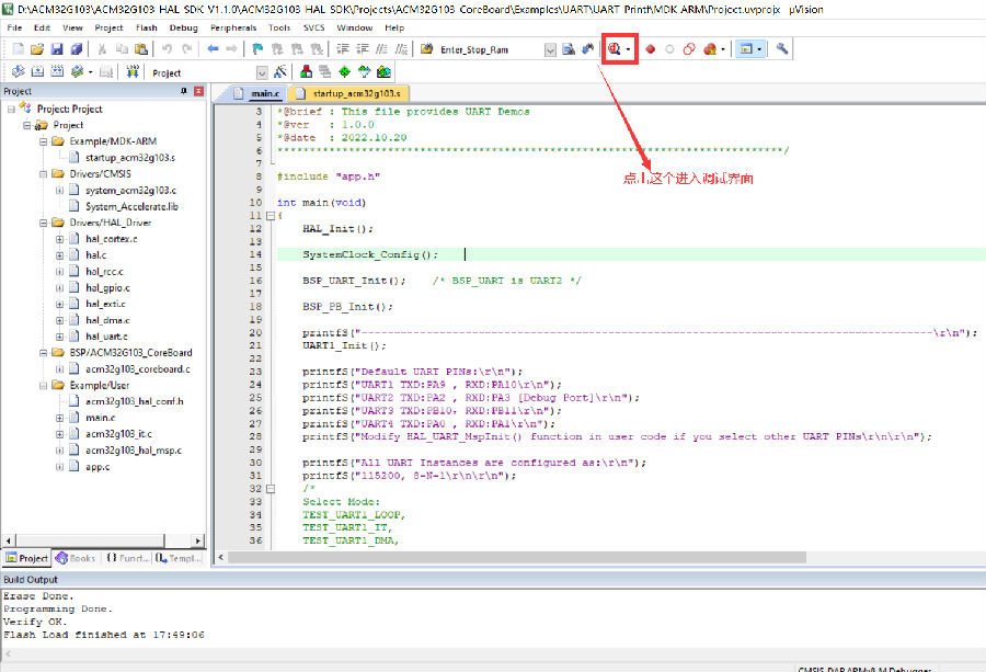 三、運行(目前芯片不支持下載后自啟動,需要按下RESET鍵后,程序才能運行),以UART_Printf_Demo為例,部分示例代碼(完整代碼見ACM32G103的SDK庫)和現象如下: