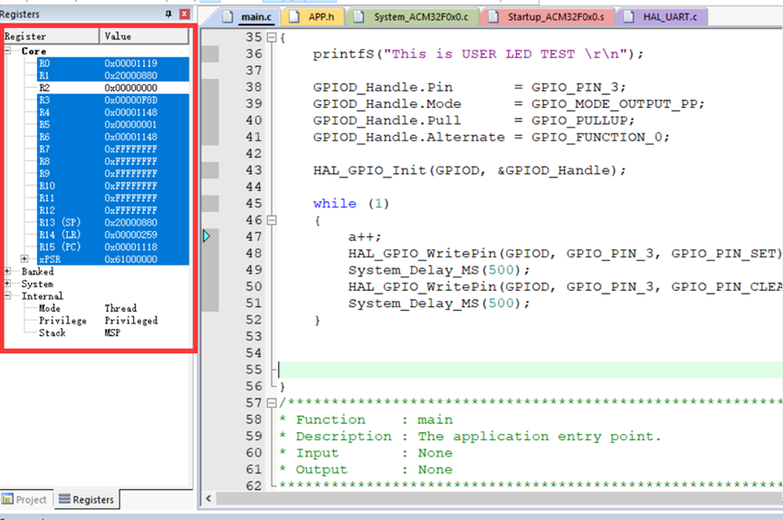 1. 查看外設寄存器的值,參考《航芯ACM32G103_用戶手冊_V1.1.pdf》查看各個外設寄存器的功能。