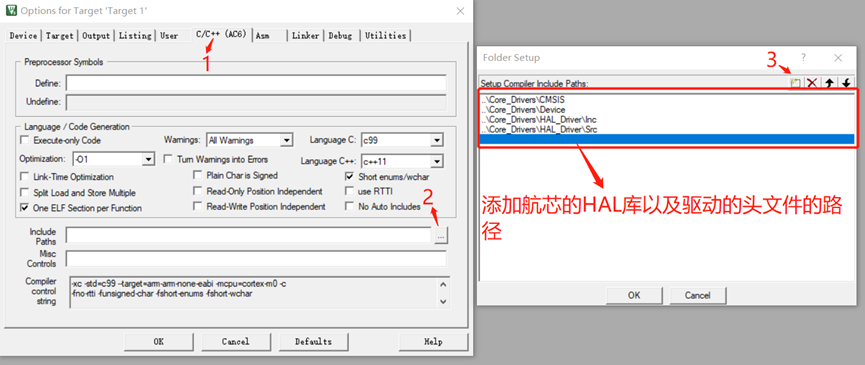 ⑤配置CC選項,Include Paths添加CMSIS、Device、HAL庫等相關路徑