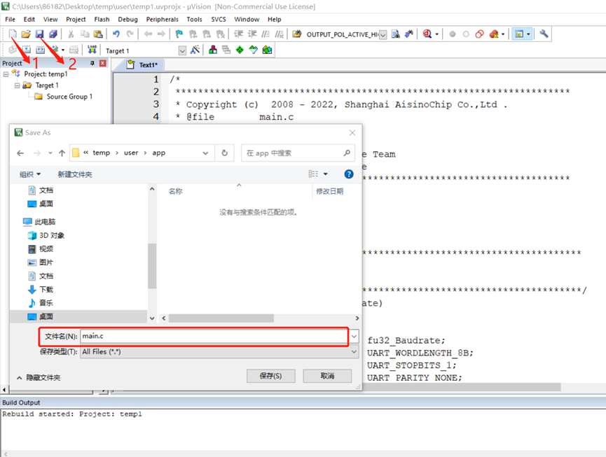 第一步打開空白頁,編寫程序(可以使用航芯提供的demo程序或者自己編寫的程序)后,第二步保存到對應的工程文件夾。