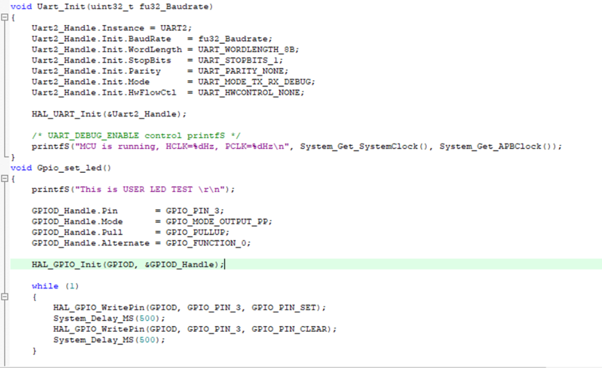 三、運行(目前芯片不支持下載后自啟動,需要按下RESET鍵后,程序才能運行),以GPIO口翻轉控制LED燈閃爍為例,部分示例代碼(完整代碼見附錄)和現象如下: