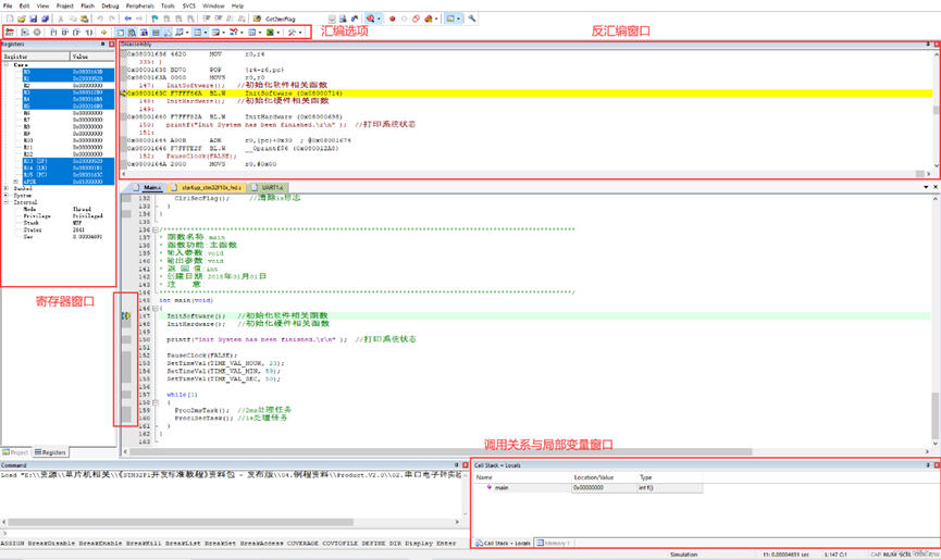 一、點擊白色按鍵或者通過Project->>Debugwithout Download進入仿真調試界面