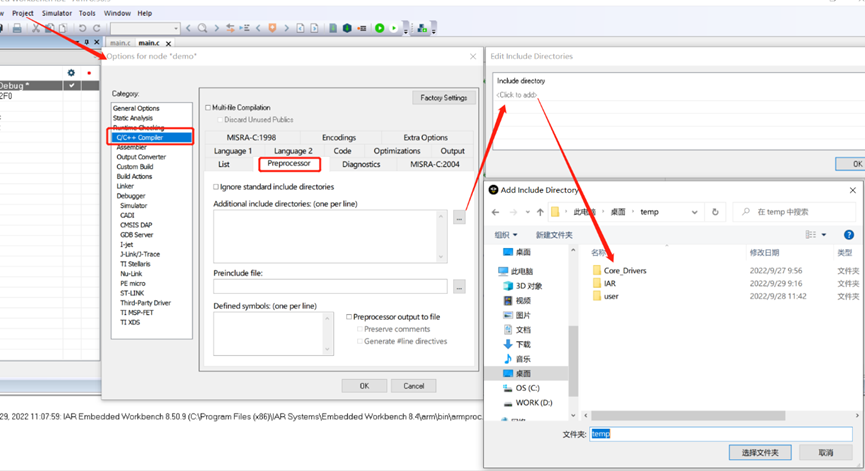 點擊Project–>>Options,選擇C/C++Complier->>Preprocessor添加頭文件的路徑。