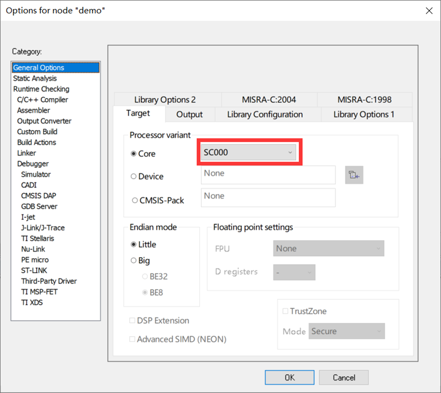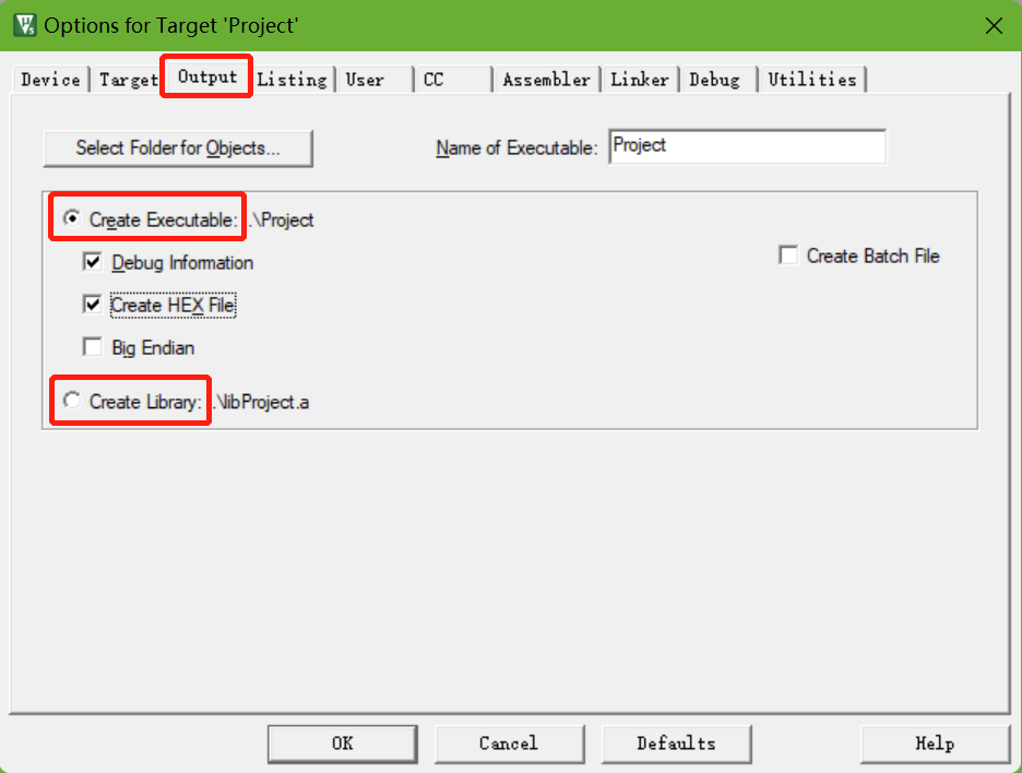 ④在彈出界面中,Output選項中,如果選擇Creat Executable,則需要在Linker中配置腳本文件,如果選擇Creat Library則不需要在Linker中配置腳本文件。