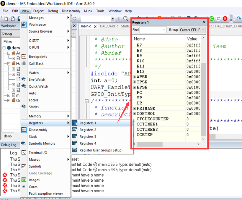 選擇主菜單View > Register 打開寄存器窗口,顯示的是CPU 寄存器。可以從寄存器窗口左上方的下拉菜單中選擇需要查看的任何寄存器組。