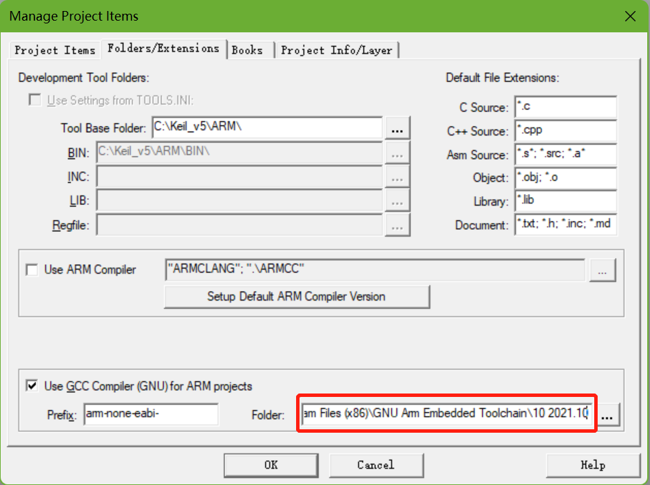 ②在彈出界面中,Folder/Extensions選項中選擇Use GCC Compiler (GNU) for ARMprojects,Folder填入GCC安裝目錄