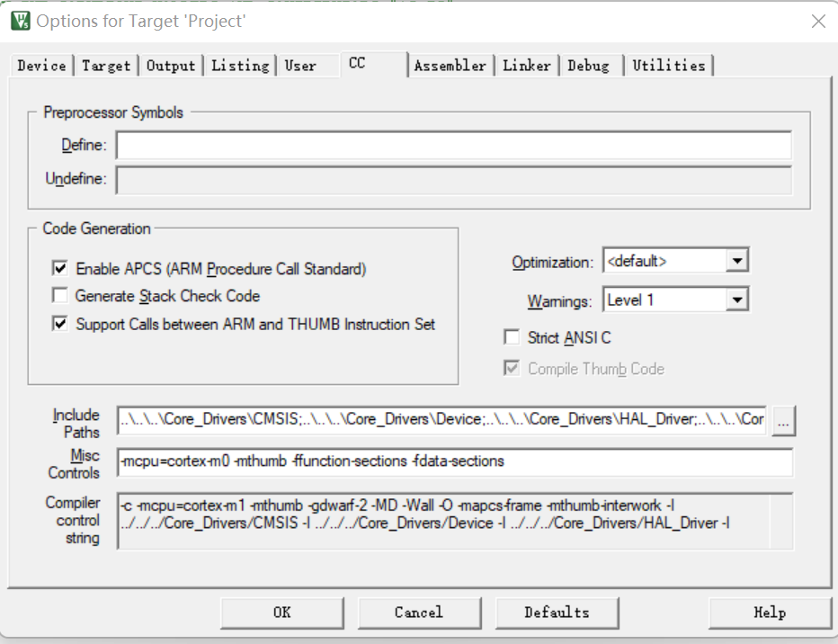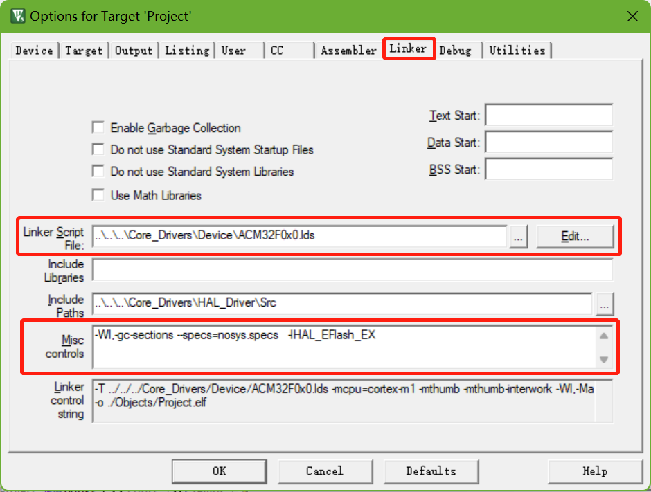 MiscControls中F0系列添加-mcpu=cortex-m0-mthumb -ffunction-sections -fdata-sections。