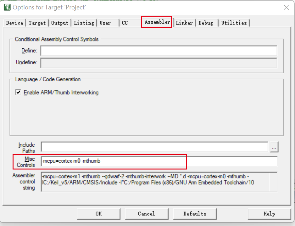⑥配置Assmbler選項,Misc Controls F0系列添加-mcpu=cortex-m0 -mthumb。