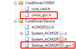 ⑧項目創建或移植時,CMSIS添加cmsis_gcc.h文件,Device更新GCC專用的.S啟動文件(Startup_ACM32F0x0_gcc.S)