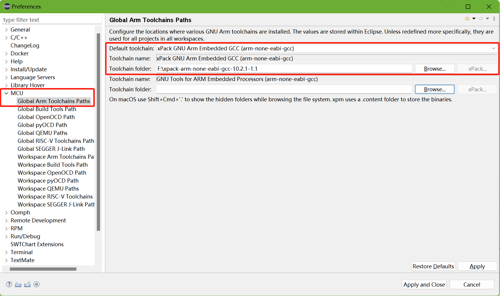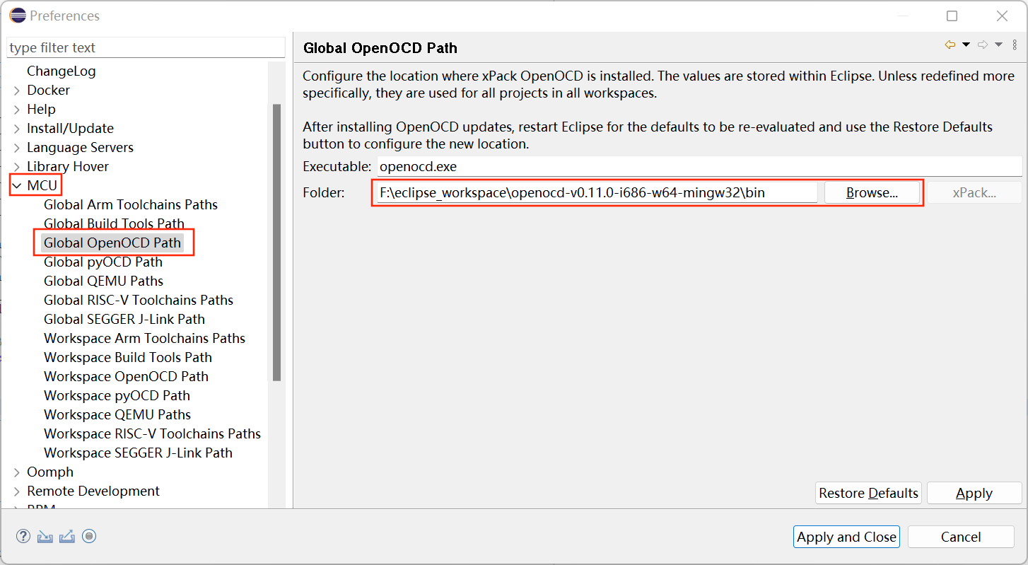 DAP調試需要使用OpenOCD插件,目前網絡上的版本是由于沒有針對ACM32系列的eFlash操作做支持,是無法直接使用的,需要使用航芯提供的版本,相應的軟件包名稱為openocd-v0.11.0-i686-w64-mingw32。直接把該軟件放入到指定的目錄下,依次點擊eclipse的Windows->Preferences->MCU->GlobalOpenOCD Path進入到設定中,指定OpenOCD工具的目錄,圖示如下: