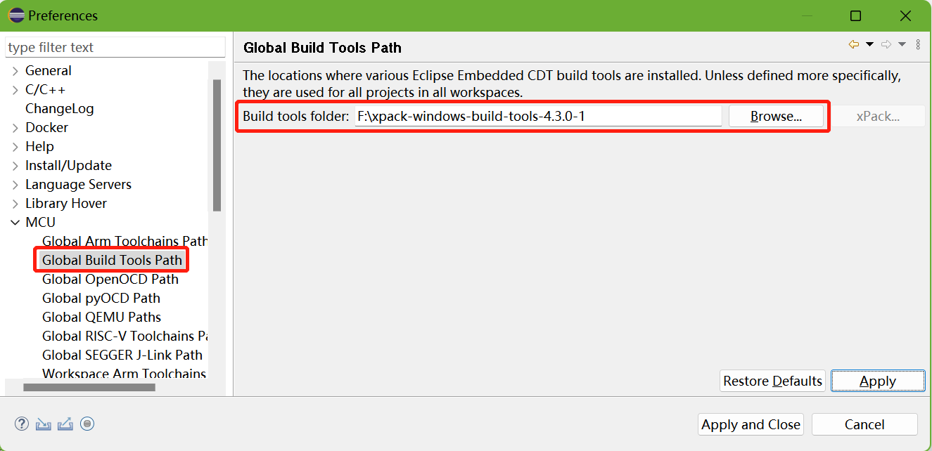編譯時有清理或拷貝的操作,需要使用到xPack Windows Build Tools中的一些工具, 同編譯工具鏈設定相似,軟件包下載完成后解壓到指定的目錄下,依次點擊Windows->Preferences->MCU->GlobalBuild Tool Path進入到設定中,指定構建工具的目錄。