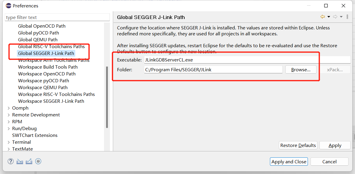 ②安裝完成后,依次點擊eclipse的Windows->Preferences->MCU->GlobalSEGGER J-Link Path進入到設定中,指定JLink工具的目錄,圖示如下: