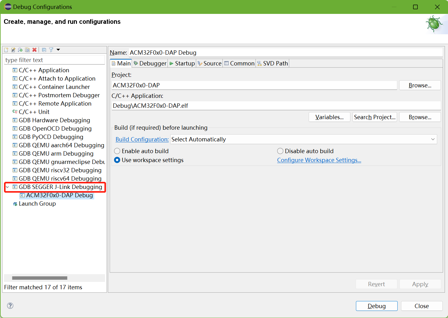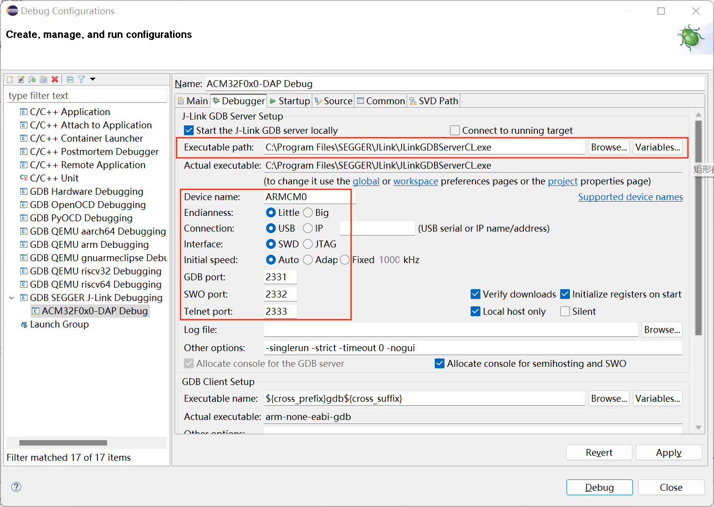 ④雙擊GDB SEGGER J-Link Debugging創建J-Link調試的配置,修改相應的配置后即可使用J-Link進行調試
