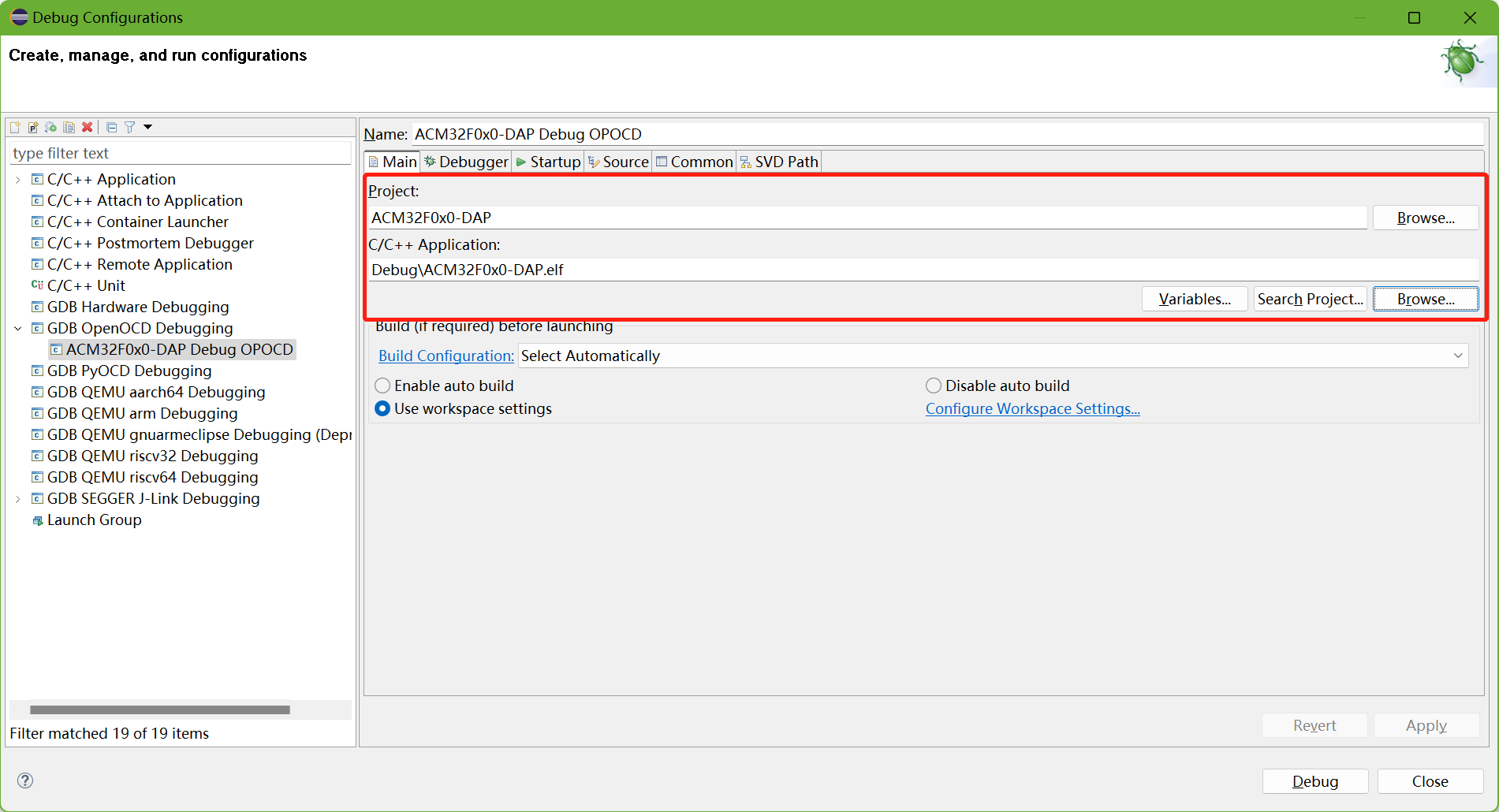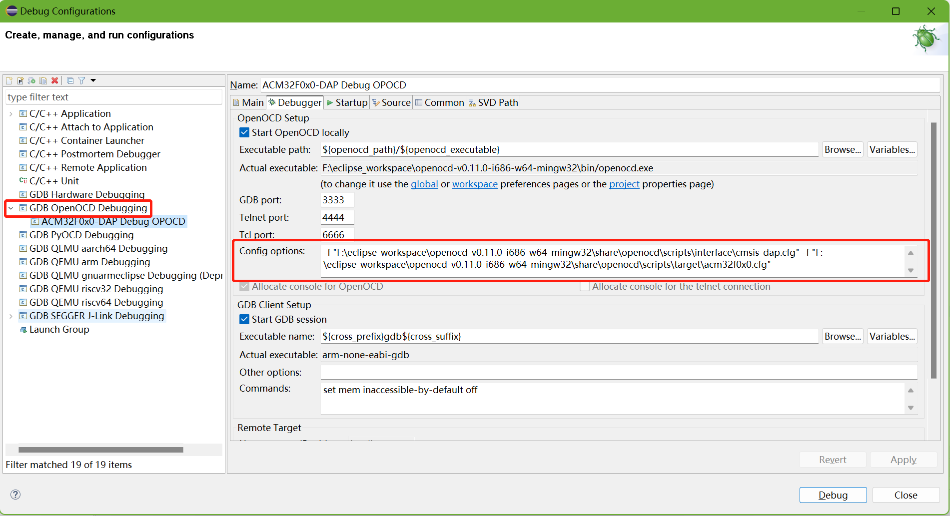 然后進入到Debug Configurations配置頁面中,雙擊GDB OpenOCD Debugging創建DAP調試的配置,修改相應的配置后即可使用DAP進行調試, 相應的配置項如圖所示: