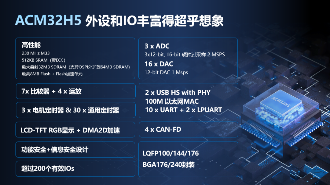旗艦級(jí)“芯”品預(yù)告——ACM32H5,2023年航芯即將推出的ACM32H5系列,提供更加豐富的外設(shè)資源、內(nèi)存、封裝選擇,更適用于中高端工控和車載場(chǎng)景應(yīng)用,將帶給客戶更強(qiáng)大的性能和更高安全性。