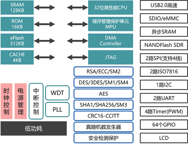 芯片包括 512K 字節的eFlash, 16K 字節的 ROM, 128K 字節的 SRAM, 4K 字節算法專用 SRAM(可開放做普通 SRAM), 片內 ROM 提供各種算法接口程序供用戶調用。