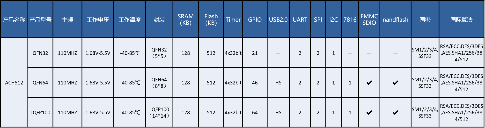 ACH512 芯片是上海航芯電子科技股份有限公司最新研制的一款基于安全算法的高性能 SOC 芯片, 主要應用于 eMMC/SD/Nandflash 大容量存儲設備、加密 U 盤、指紋識別等市場。 芯片采用 32 位內核,片內集成多種安全密碼模塊,包括SM1、 SM2、 SM3、 SM4、 SSF33 算法以及RSA/ECC、 ECDSA、 DES/3DES、AES128/192/256、SHA1/256/384/512 等安全算法,芯片提供了多種外圍接口: USB2.0、UART、SDIO、 ISO7816、 I2C、 SPI、 NFM, MIM 等。