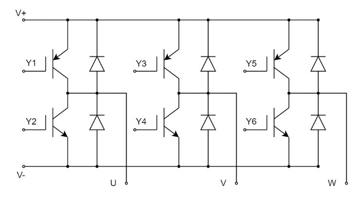 其中,n表示電機的轉速,f表示電機電源信號頻率,s表示電機的轉速差,p表示電機的極對數。從上式可以看出,電機的轉速和電源信號頻率成正比關系。因此,只更改頻率即可改變電機的轉速。變頻器正是依據該公式來實現對電機的變速控制。通常,變頻器由整流電路,濾波電路,逆變電路以及控制電路4個部分組成。外部輸入的三相電會經過整流電路和濾波電路得到穩定的直流電。直流電再通過逆變電路得到用以驅動交流電機的三相電。逆變電路一般會選用IGBT來實現,以期得到足夠的驅動電流,其電路結構示意圖如下圖所示: