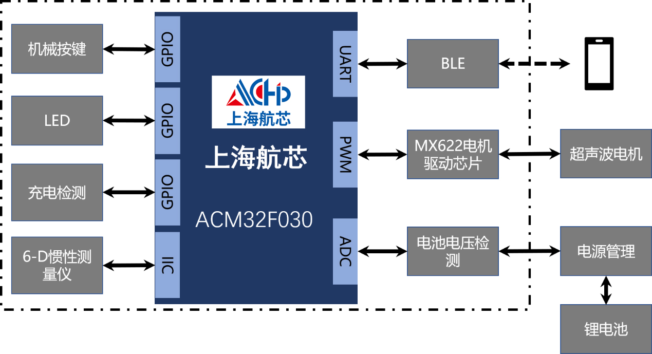本文描述的電動牙刷方案,是基于上海航芯ACM32F030系列的MCU進行設計,整體的方案框圖如下所示: