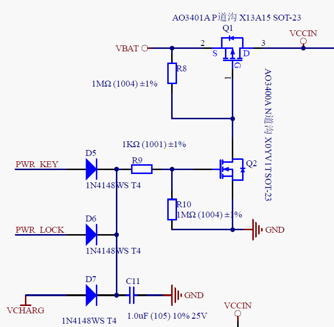正常情況下,設備不在充電時,VCHARG電壓為0,需要關機時,按鍵彈開,PWR_KEY為低電平,芯片內部程序也將PWR_LOCK拉低,此時Q2關斷,Q2的D極電壓同VBAT,從而引起Q1斷開,VCCIN斷電,系統關機。而開機時,按鍵按下,PWR_KEY先被拉至高電平,Q2導通,Q2的D極拉低,則Q1導通,設備供電,程序檢測到開機,拉高PWR_LOCK,此時,盡管按鍵彈開,PWR_LOCK仍然會提供Q2的導通電壓,系統正常工作。充電時,Q2的導通電壓會由VCHARG提供,系統保持在工作狀態,此時會程序會檢測系統的運行狀態,在不需要啟動時,進入休眠狀態。