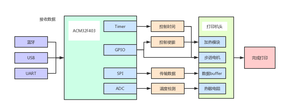 本方案可以通過UART、USB和藍牙接口接收數據,并通過ACM32F403芯片的Timer,GPIO,ADC、SPI等模塊進行熱敏打印機頭的打印工作。