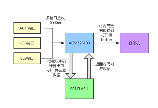 1)從UART、USB或BLE接口接收需要打印文字的GBK碼;