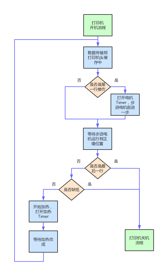 4)判斷是否是最后一行或者是否缺紙,如果是進入打印機關機流程;
