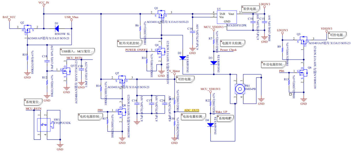 1)供電:系統采用單節鋰電池4.2V或者USB 5V供電;