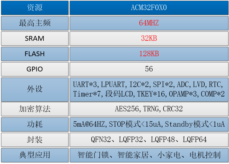 ACM32F0X0 系列是一款支持多種低功耗模式的通用MCU。集成16路Touch觸摸按鍵、12位1.6 Msps高精度ADC以及模擬比較器COMP、運算放大器OPAMP、段式LCD控制器,內(nèi)置高性能定時器TIMER、多路UART、LPUART、SPI、I2C等豐富的通訊外設(shè),內(nèi)建AES、TRNG、CRC32等信息安全模塊,支持多種低功耗模式,具有高整合度、高抗干擾、高可靠性等特點。本產(chǎn)品采用高性能內(nèi)核,最高工作頻率64MHz。