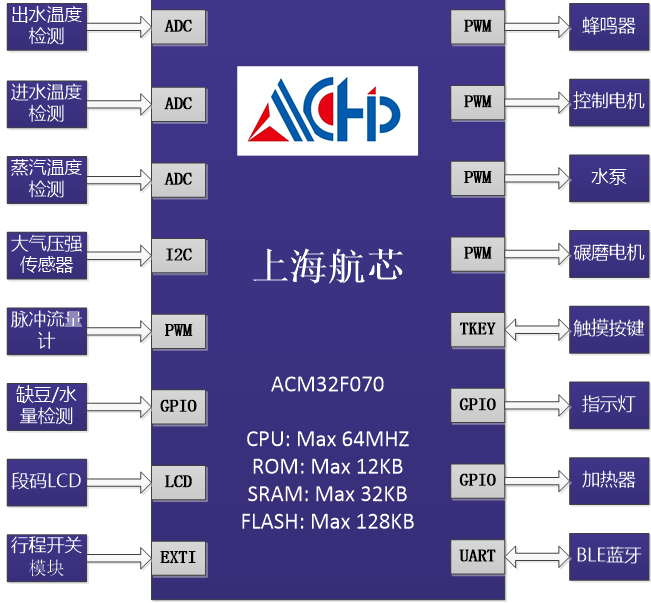 本文描述的咖啡機(jī)方案,基于上海航芯ACM32F070系列的MCU進(jìn)行設(shè)計,整體的方案框圖如下所示: