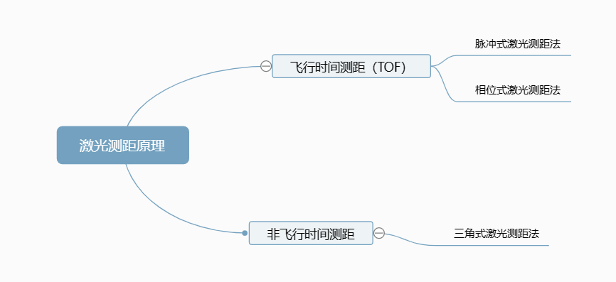 根據(jù)基本原理,實現(xiàn)激光測距的方法有兩大類:飛行時間(TOF)測距和非飛行時間測距,飛行時間測距中有脈沖式激光測距和相位式激光測距,非飛行時間測距主要是三角激光測距,如下圖所示: