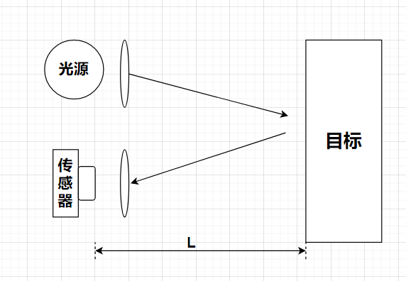 三角測距法即光源、被測物面、光接收系統(tǒng)三點共同構成一個三角形光路,由激光器發(fā)出的光線,經過匯聚透鏡聚焦后入射到被測物體表面上,光接收系統(tǒng)接收來自入射點處的散射光,并將其成像在光電位置探測器敏感面上,通過光點在成像面上的位移來測量被測物面移動距離的一種測量方法。